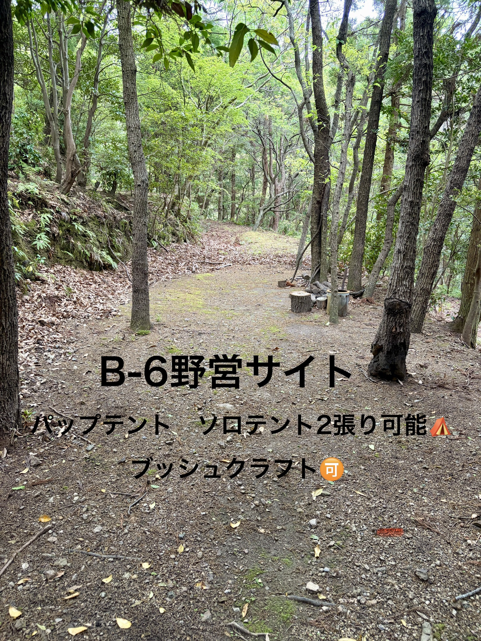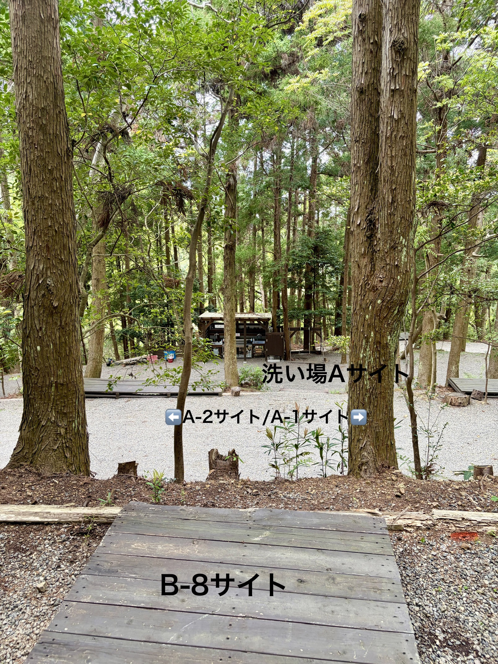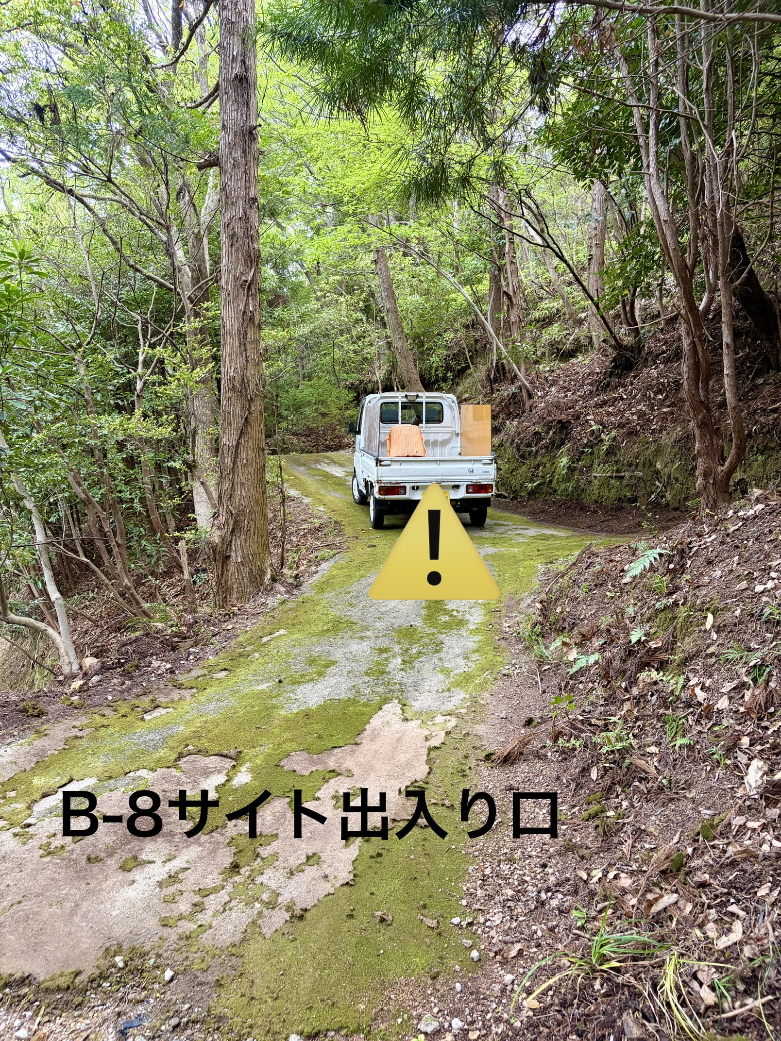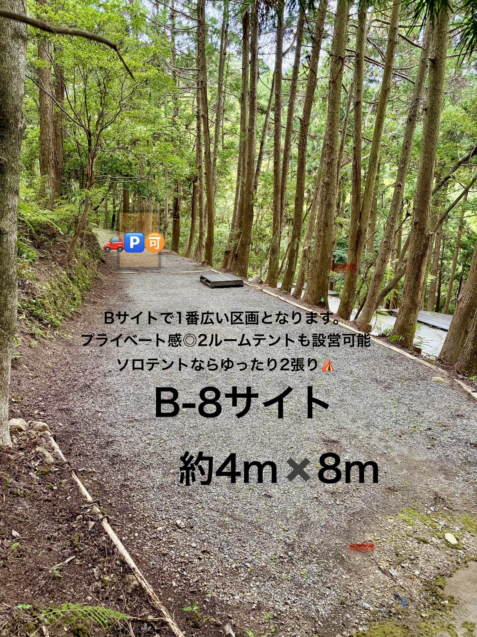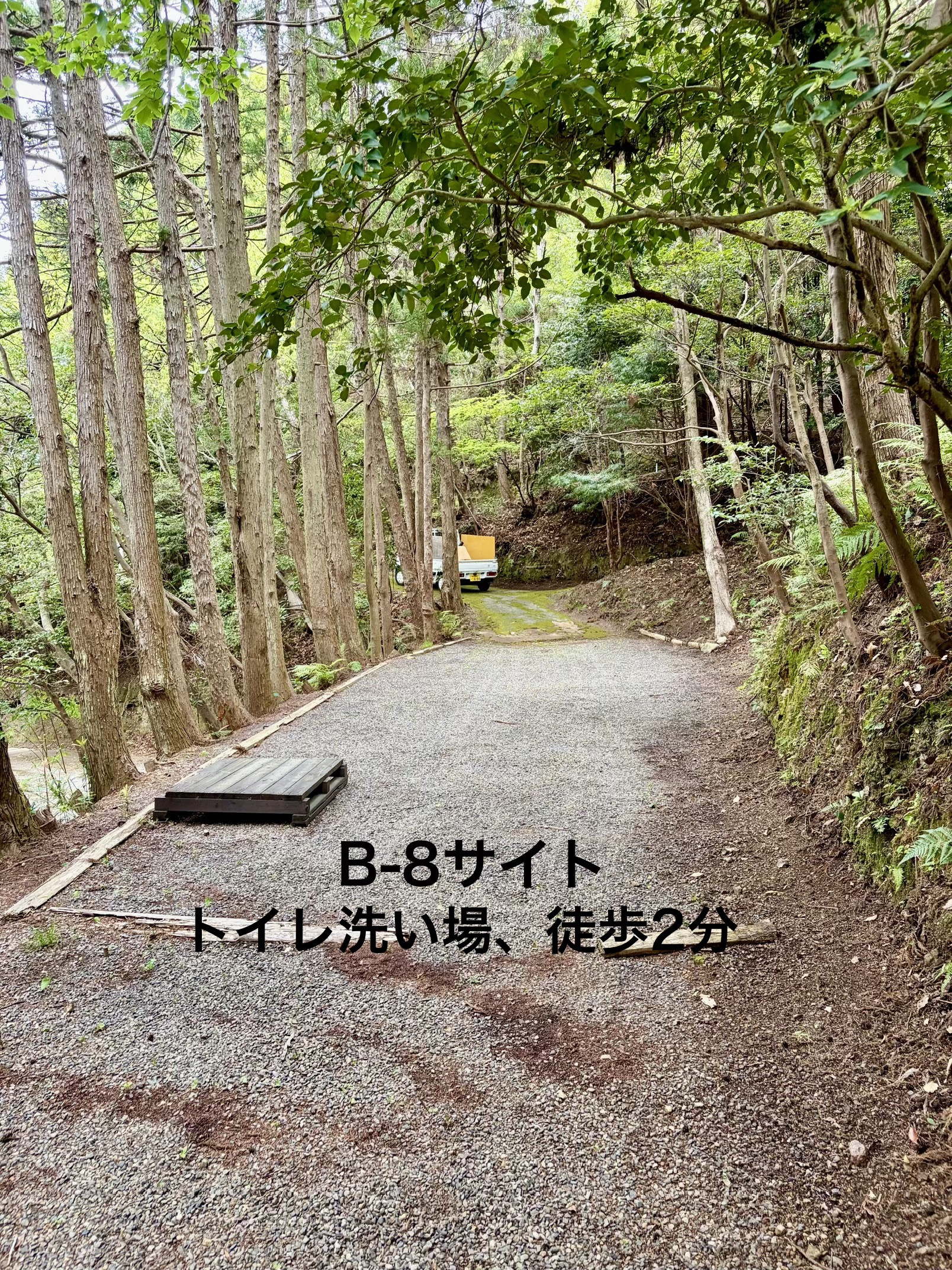 森の中の雰囲気◎ トイレ洗い場近く 軽自動車は乗り入れ可能。(普通自動車は駐車しづらくなっております。徒歩1分-洗い場前が別駐車場としてお使いいただけます。)